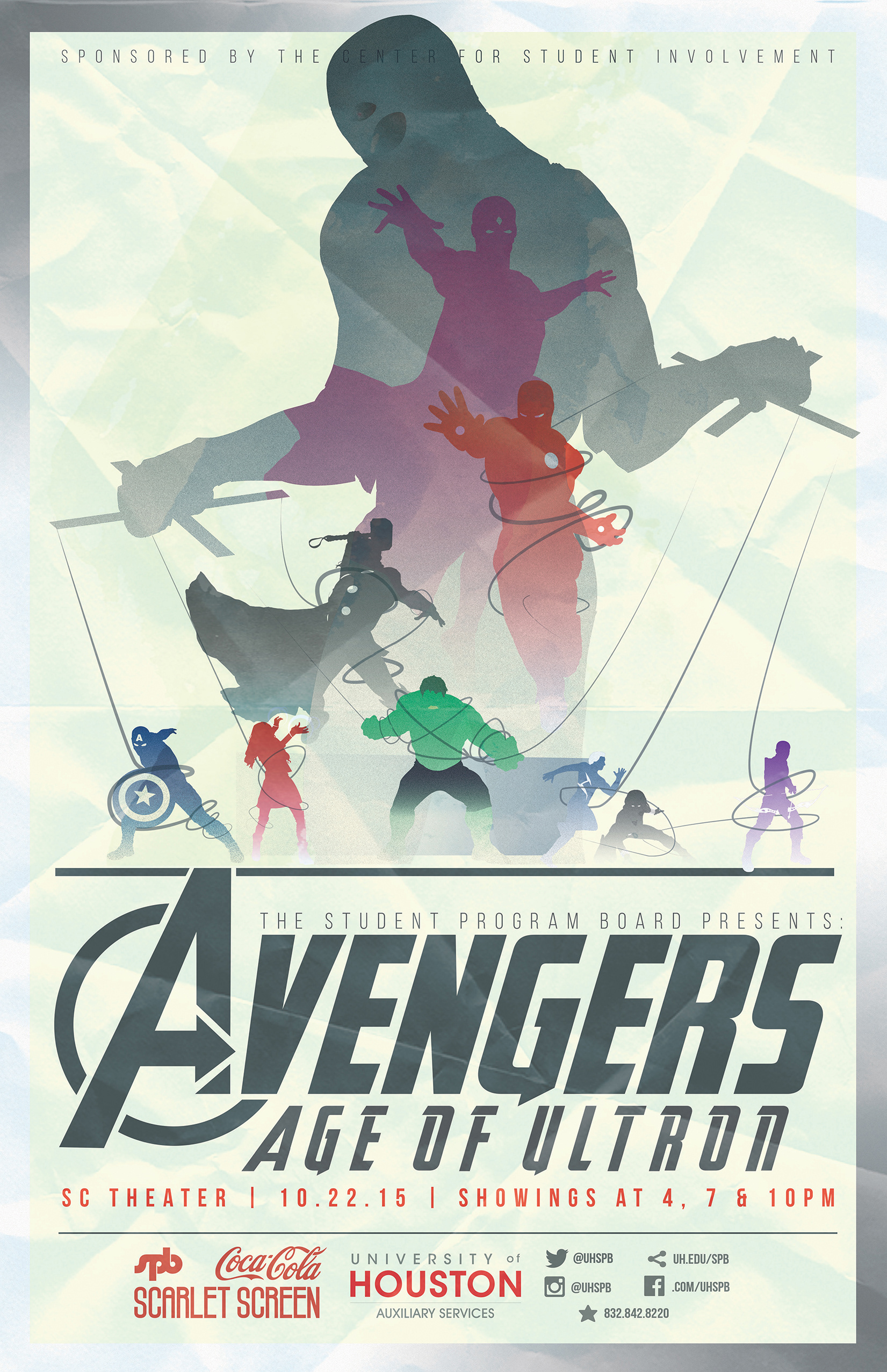An minimalist-inspired illustrated movie poster for a showing of the Avengers: Age of Ultron that the Student Program Board at the University of Houston was having.